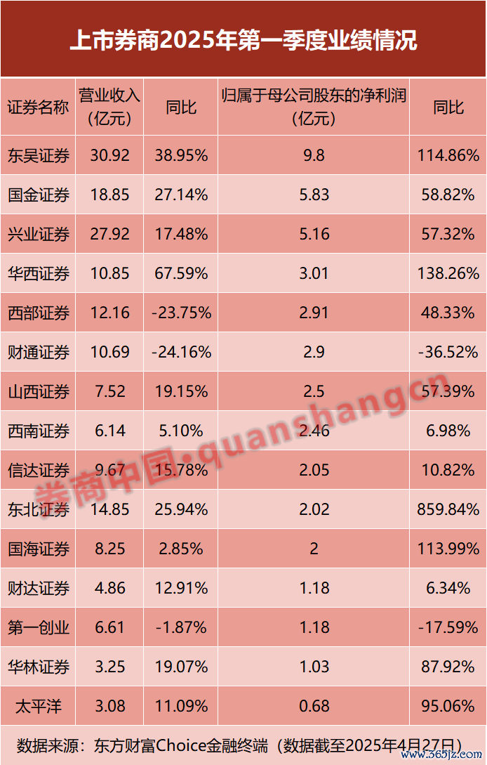 截至4月27日巨牛盈,共有15家上市券商披露2025年一季报,其中超八成券商净利润实现同比增长。其中,东吴证券、华西证券、东北证券、国海证券4家券商一季度净利润同比大增超100%。