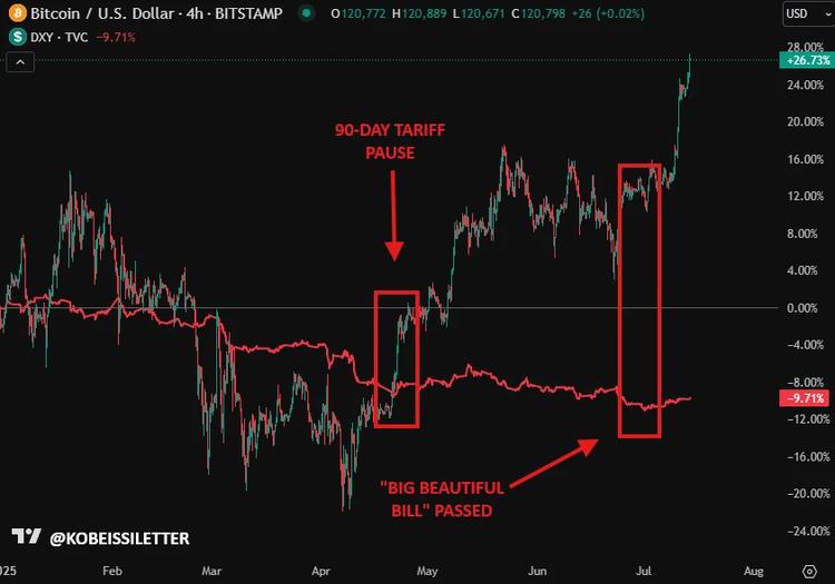 如今的比特币势头如此迅猛,一天之内就能多次刷新历史高点(ATH)。自7月3日美国众议院通过特朗普总统的《大而美法案》以来,比特币价格已暴涨15,000美元。黄金若未能引起警觉,那比特币的狂飙应足够敲响警钟。
