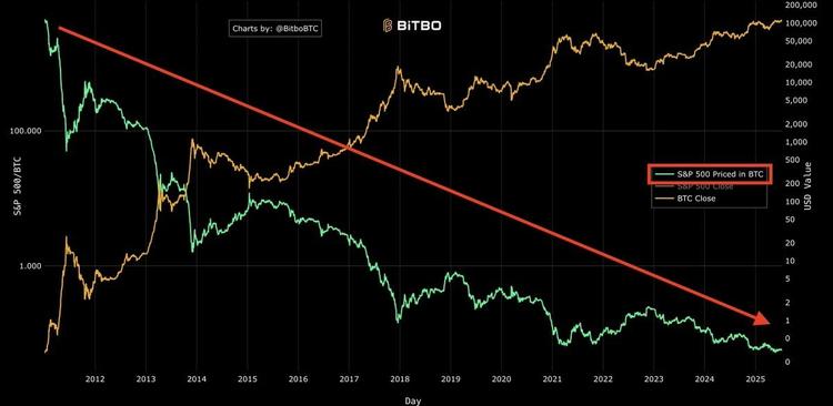 年初至今,按比特币计价,标普500指数已下跌15%。而若追溯到2012年,以比特币计价的标普500指数更是暴跌了惊人的99.98%。现状是:比特币价值飙升,美元价值缩水。