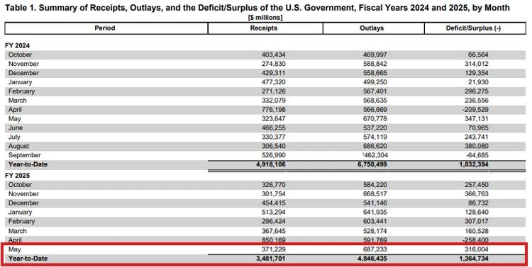 进入7月,市场得到的数据显示,美国仅在2025年5月单月就录得3160亿美元的财政赤字。这是有史以来第三高的月度赤字水平。起初,由于马斯克对支出法案提出反对,市场还抱有期待。