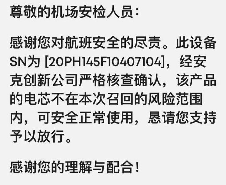 此外,安克还给机场安检人员出具了一份声明,意在告知安检人员该产品电芯可以安全正常使用,并恳请安检人员予以放行。
