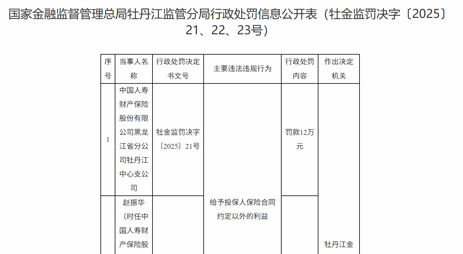 8月14日创高网,国家金融监督管理总局牡丹江监管分局行政处罚信息公开表显示,中国人寿财产保险股份有限公司黑龙江省分公司牡丹江中心支公司因给予投保人保险合同约定以外的利益被罚款12万元,负责人赵某被警告并罚款4万元。