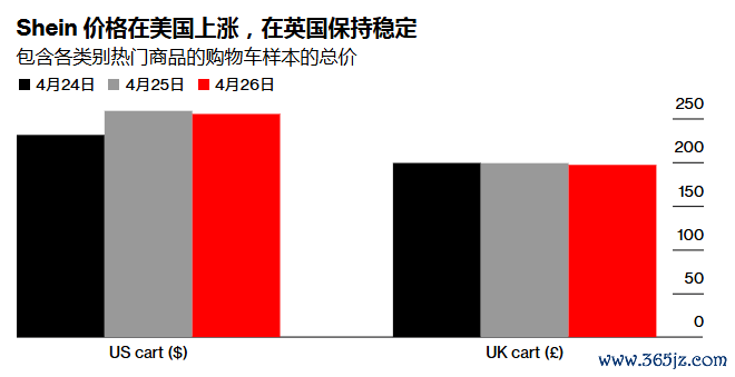根据媒体以50种不同类别商品组成的购物车抽样数据显示,在4月24日至26日期间,Shein在美国的整体价格平均上涨了约10%。期间,50件商品中有7件在美国市场下架。相比之下,Shein在英国的价格基本保持不变,且无商品下架。