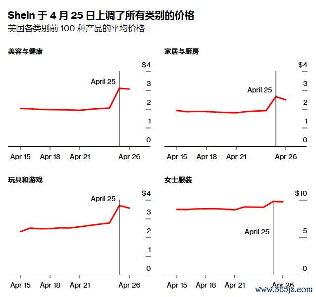 虽然大范围的价格调整发生在周五,但部分商品此前已开始提价。4月22日,Shein平台上数十款女士服装类热销产品的价格上涨,使该品类前100名商品的平均价格从8.68美元上升至9.06美元,涨幅超过4%。